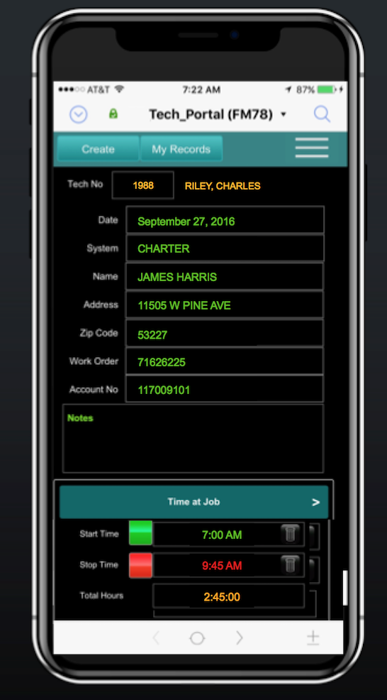 Swipe the screen to the left and the tech can enter the appropriate codes in the billing code portal. All data is real-time and can be viewed from the dispatch center instantaneously.