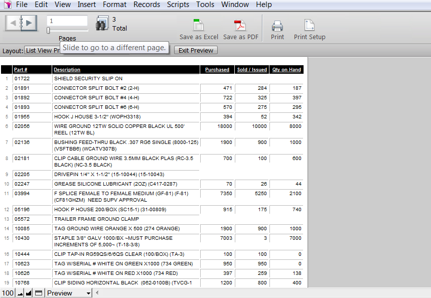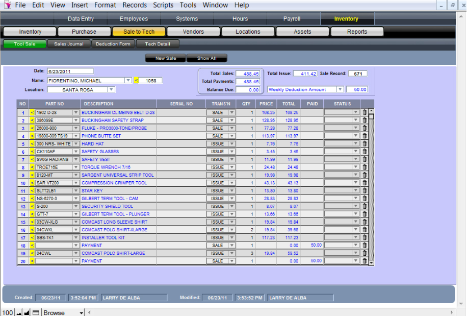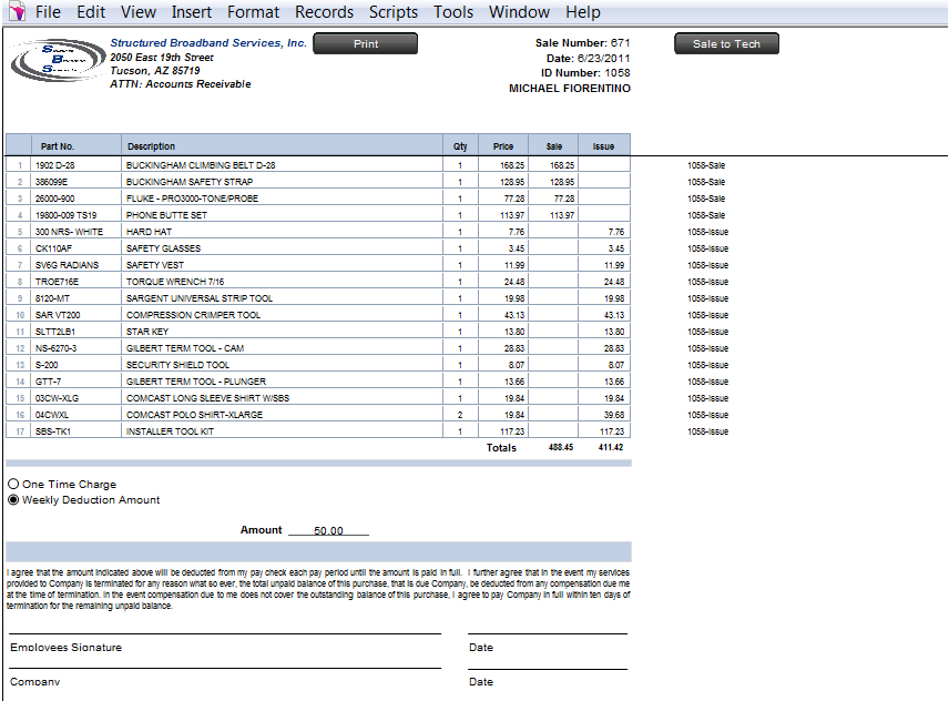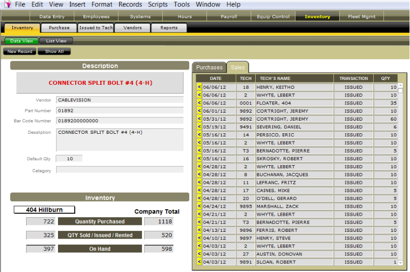 When selling or issuing items to a tech, simply enter the part number and enter whether the part is being "Issued" or "Sold." The totals will be kept separate so you know exactly what the tech owes for items purchased, and the value of each item that was issued to the tech.