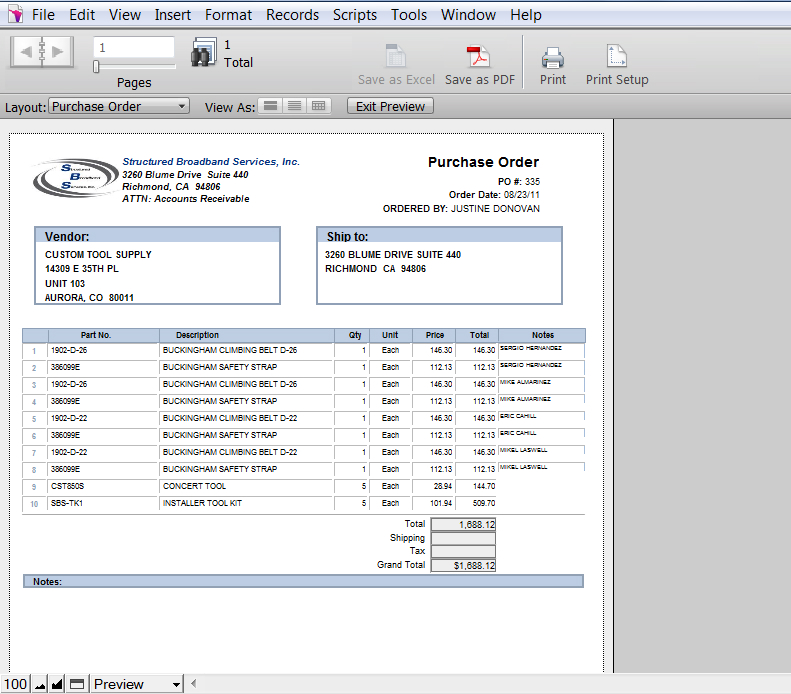 Finally, with the click of a mouse, generate a Purchase Order that can be Printed, Saved as a PDF file or emailed directly to your vendor from FileMaker.