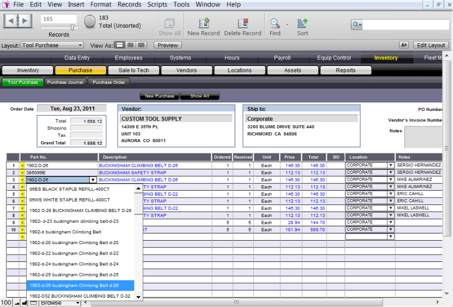Creating Purchases is a breeze. Simply choose the part number from the drop down list, which contains only items sold by the Vendor you entered on the top of the order. Another option is to scan Part Numbers as bar codes from a master list of items. This will eliminate the need to enter part numbers.