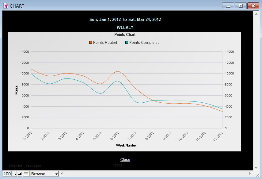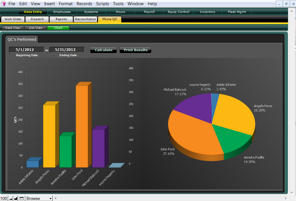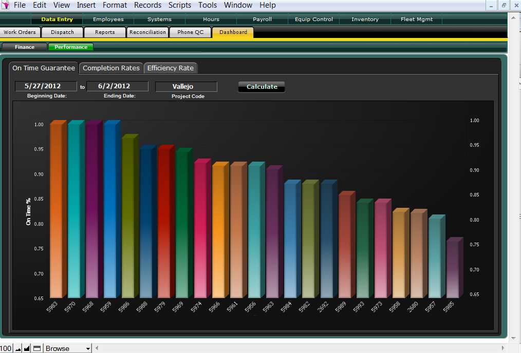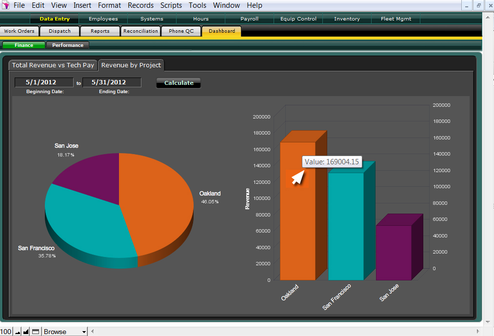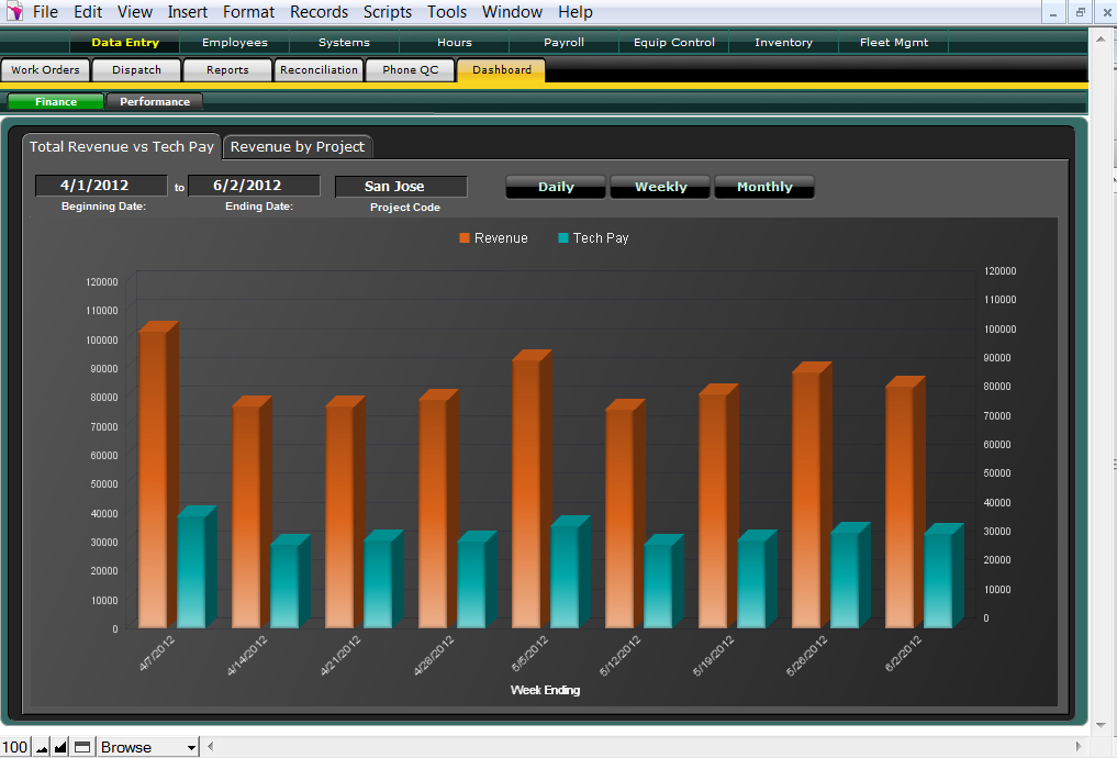 Generate charts to show Revenue vs Production over a period of time. View Daily, Weekly or Monthly totals. View totals company wide or break them out by Project.