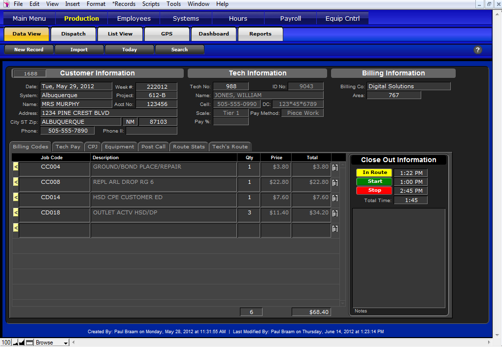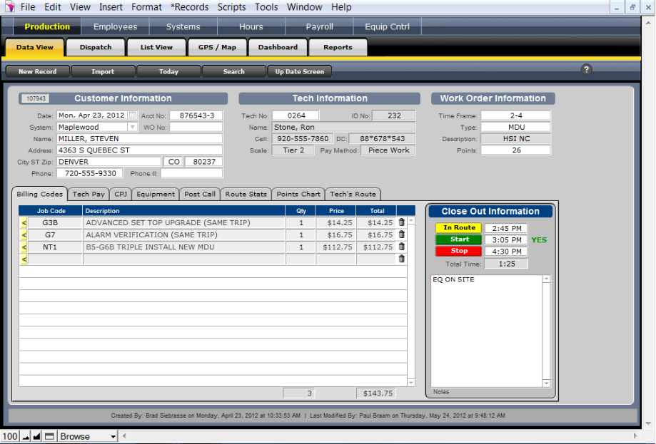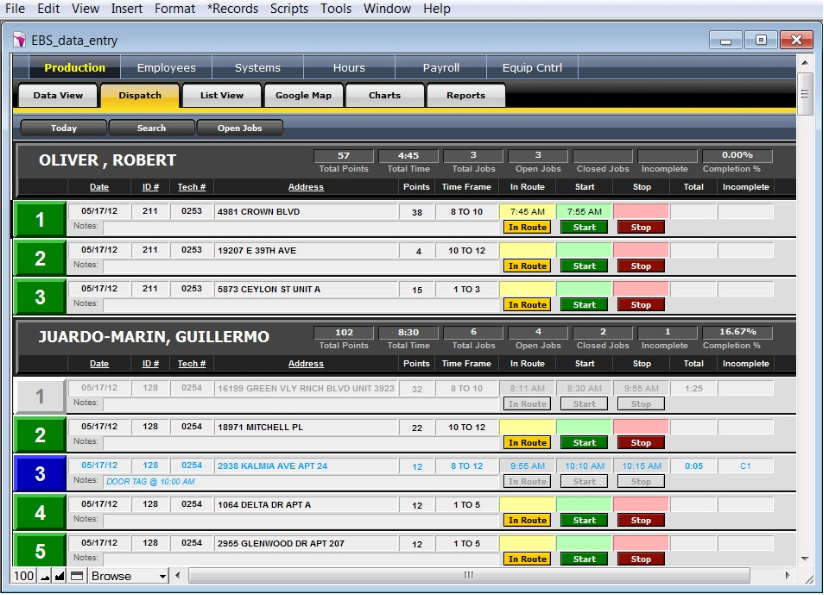 The Dispatch tab summarizes each tech's routed work for the day. Color coded sequence numbers makes it easy to visualize Open, Closed and Incomplete jobs.