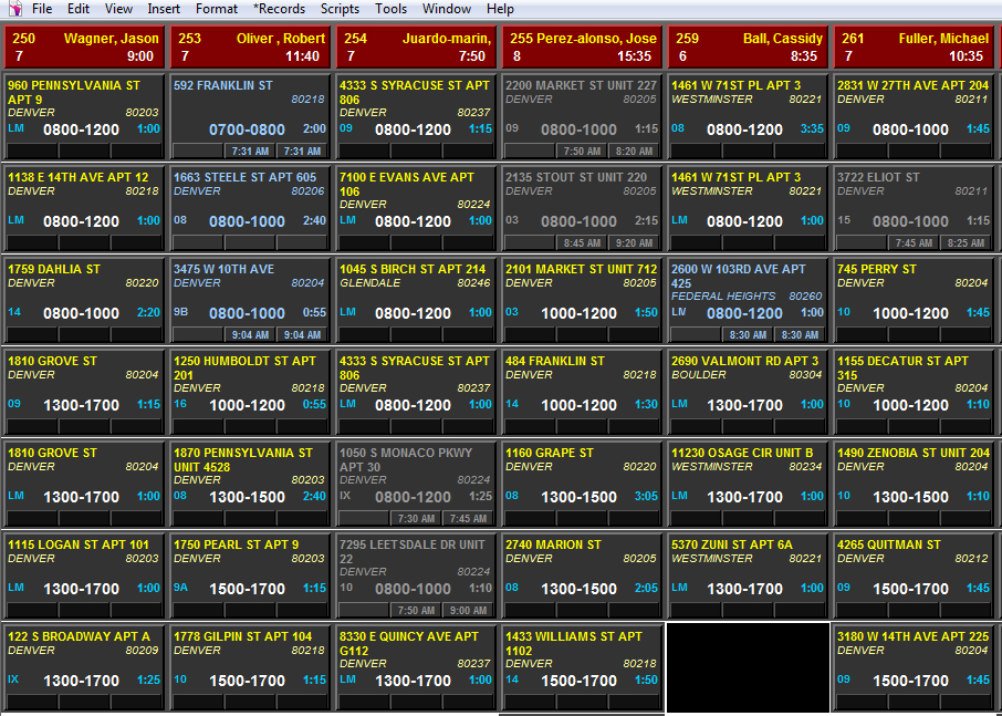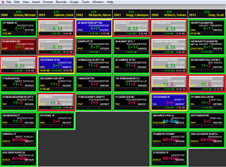 This is another version of a Dispatch Update board. Here Black Box = Open Job; Gray Box = Completed Job; Blue Box = Incomplete Job; Red Box = Danger of missing Time Frame (tech is not yet in route within 1 hour of Time Frame expiration). Dispatch board can handle any number of routes.
