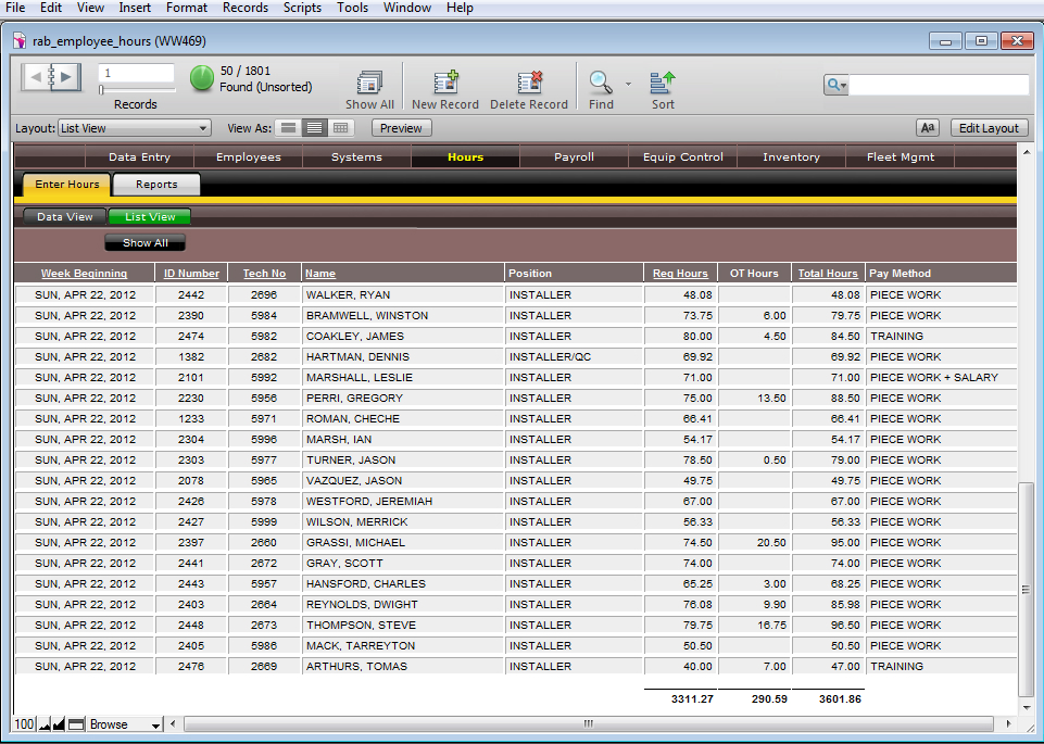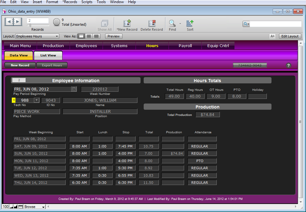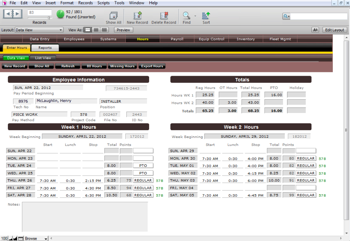 The Hours Sheet above is a custom solution for a company that employs a two-week pay period and pays it's techs by the point.