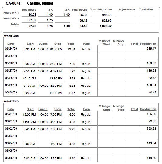 California's labor laws are unique, and this Hours Sheet reflects some of the differences that exist in the OT calculations. While this tech did not work over 40 hour in either week, he still earned time & a half and double time.