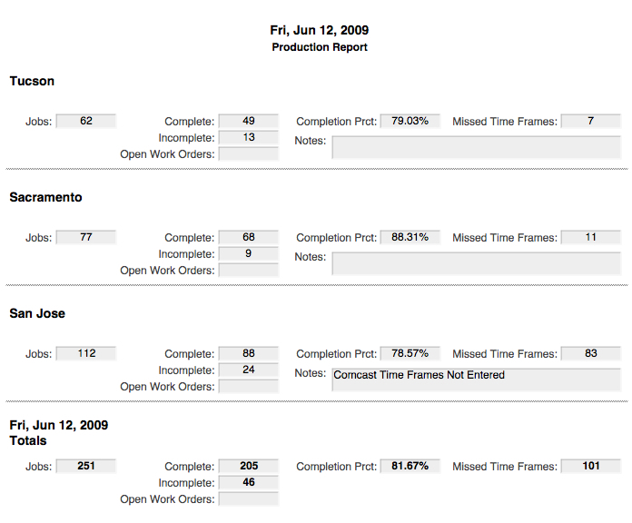 This report summarizes the previous days results including number of work orders issued, complete and incomplete jobs, completion rate and missed time frames. This report can also be generated throughout the day so you see results up to the minute.
